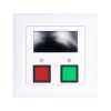Zimmersteuerung mit BUS-Anbindung. LCD-Display 1×6/2×8 Zeichen. links Ruftaste rot eckig, rechts AW-/Q-Taste grün eckig. Funktionen: Ruf, WC-Ruf, REA-Ruf. Frontplatte Edizio Due. (Typ: P/312GP/S-CXC)